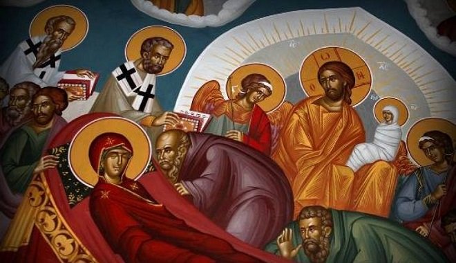 Η Κοίμηση της Θεοτόκου, του κρητικού αγιογράφου Ιερέως Βίκτωρος (λεπτομέρεια). Μουσείο Μπενάκη. «Απόστολοι εκ περάτων συναθροισθέντες ενθάδε…» Η σύναξη εκ περάτων και η ενταύθα παρουσία των Αποστόλων, όπως και στις κατά τόπους Γεθσημανές, δηλαδή όπου τελούνται αυτές τις μέρες οι θεομητορικές παρακλήσεις -πράγμα που σημαίνει παντού- κάνουν κάθε χώρα, κάθε πόλη, χωριό, μοναστήρι, εκκλησία, ξωκλήσι και κατοικία οικουμένη! Έναν κόσμο αγκάλη! Εκεί, εδώ και παντού σ’ αυτήν την μικρή, ευρεία και απέραντη κόγχη της Πλατυτέρας βρίσκεται όλος ο κόσμος! (Που δεν βλέπουν σε καμιά περίπτωση οι εκατομμυριούχοι τουρίστες-κοσμοναύτες του διαστήματος οι οποίοι ξοδεύουν έναν πακτωλό χρημάτων για να βρεθούν απλώς στο διάστημα. Στο απόλυτο κενό! Ενώ, όπως είπε ο όσιος Παΐσιος, εμείς πάμε στον Θεό με ένα παξιμάδι)! Πλατυτέρα, Παναγία Βλαχερνίτισσα, Εκκλησία αγίου Δημητρίου, ...