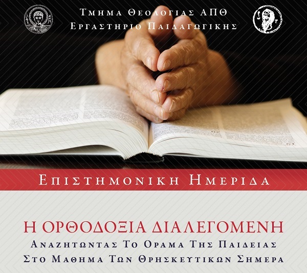 Το Τμήμα Θεολογίας ΑΠΘ και το Εργαστήριο Παιδαγωγικής του ιδίου Τμήματος διοργανώνουν την Παρασκευή 27 Απριλίου 2018 Επιστημονική Ημερίδα με θέμα: «Η Ορθοδοξία διαλεγόμενη: Αναζητώντας το Όραμα της Παιδείας στο Μάθημα των Θρησκευτικών Σήμερα». Ώρα Έναρξης: 17:45′. Αίθουσα: Β΄ Αμφιθέατρο Θεολογικής Σχολής ΑΠΘ. Μετά το τέλος της ημερίδας θα χορηγηθούν βεβαιώσεις συμμετοχής. Δείτε το αναλυτικό πρόγραμμα.