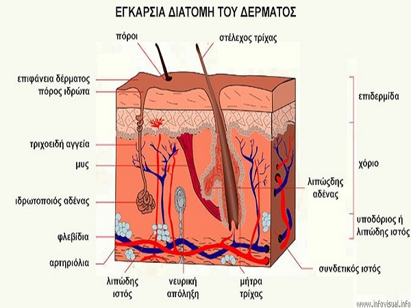 (Προηγούμενη δημοσίευση: http://www.pemptousia.gr/?p=172224) Το δέρμα αποτελείται από τρία τμήματα, τον υποδόριο ιστό, το χόριο και την επιδερμίδα. Ο πρώτος αποτελείται από τον λιπώδη ιστό και περιέχει λιποκύτταρα, αιμοφόρα αγγεία νευρικές και ελάχιστες μυϊκές ίνες και ο ρόλος του είναι η προστασία του οργανισμού και η απόδοση ομοιογένειας και απαλότητας στην υφή της επιδερμίδας. Το χόριο είναι ένα ελαστικό τμήμα τριών περίπου χιλιοστών το οποίο τρέφει την επιδερμίδα που ακουμπά επάνω του και επιδιορθώνει τα κύτταρα. Αποτελείται κυρίως από ινοβλάστες που παράγουν δομικά υλικά, κυρίως κολλαγόνο που δίνει σφριγηλότητα στην επιδερμίδα και απορροφά τους κραδασμούς και δευτερευόντως ελαστίνη που δίνει την απαραίτητη ελαστικότητα. Στο χόριο οφείλεται και διεπαφή με το φυσικό περιβάλλον καθώς εκεί βρίσκονται οι θύλακες των τριχών, ιδρωτοποιοί και σμηγματογόνοι ...