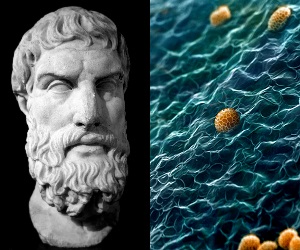 4. Η ΠΡΟΣΕΓΓΙΣΗ ΤΟΥ ΕΠΙΚΟΥΡΟΥ (341-270 π.Χ.) 4.1. Η φιλοσοφία του Επίκουρου Ο Επίκουρος ο Αθηναίος συνδύασε τη Φυσική του Δημόκριτου του Αβδηρίτη και την Ηθική του Αριστοτέλη του Σταγειρίτη, αλλά και μετεξέλιξε τις ιδέες τους δημιουργώντας μια συνεπή κοσμοθεωρία χωρίς εννοιολογικά κενά. Ο φιλόσοφος δέχθηκε τη δημοκρίτεια ατομική θεωρία, σύμφωνα με την οποία όλα στη Φύση αποτελούνται από άφθαρτα άτομα και κενό. Το σύμπαν είναι αιώνιο («τίποτα δεν δημιουργείται από το τίποτα»), η συνολική ύλη διατηρείται, αλλά αλλάζει διαρκώς μορφές, αφού ο αριθμός των ατόμων είναι άπειρος, όπως και οι συνδυασμοί τους στην αιωνιότητα, που δημιουργούν εξελικτικά ήλιους, σφαιρικούς κόσμους (πλανήτες), βράχους και ζωντανούς οργανισμούς. Οι θεοί υπάρχουν μέσα σε μακάρια αθανασία, αλλά δεν ασχολούνται μαζί μας (δεν υπάρχει θεία πρόνοια), ...