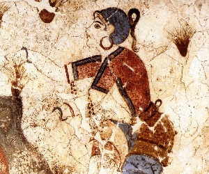 Τα δε βαπτόμενα πάντα τας χρόας από των βαπτόντων λαμβάνει. πολλά μεν γαρ τοις άνθεσι βάπτεται τοις φυομένοις, πολλά δε ρίζαις, πολλά δε φλοιοίς η ξύλοις η φύλλοις η καρποίς και όλως όσα χρόας ιδίας έχει. αεί γαρ από πάντων αυτών, άμα τω τε υγρώ και θερμώ των χρωμάτων συνεισιόντων εις τους των βαπτομένων πόρους, όταν αποξηρανθή, τας απ’ εκείνων χρόας λαμβάνει… Αριστοτέλης, Περί χρωμάτων, 794α,16. Εικ. 1. Κροκοσυλλέκτρια στο Ακρωτήρι της Θήρας, 1650 π.Χ. Μουσείο Προϊστορικής Θήρας. Η ανωτέρω καταγραφή του Αριστοτέλη φανερώνει τις ανεξάντλητες πηγές της φύσης, όπως άνθη, ρίζες, φύλλα, φλοιοί, ξύλα και καρποί, που χρησιμοποιούσαν στη βαφική οι αρχαίοι τεχνίτες βαφείς. Ο κρόκος, η πορφύρα, το ερυθρόδανο και το ινδικό θεωρούνται τα αρχαιότερα βαφικά υλικά που χρησιμοποίησε ο ...