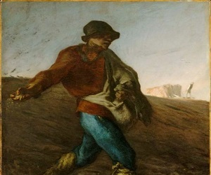 JEAN-FRANÇOIS MILLET (ΖΑΝ ΦΡΑΝΣΟΥΑ ΜΙΓΕ) Ο ΣΠΟΡΕΑΣ (1850) Το γνωστό έργο Ο σπορέας (“Le semeur”) (1850) ανήκει στο Γάλλο καλλιτέχνη Jean-François Millet (Ζαν Φρανσουά Μιγέ) (1814–1875). Ο Millet ήταν ζωγράφος και χαράκτης και ανήκε στο ρεύμα των ρεαλιστών του δεύτερου μισού του 19ου αιώνα καθώς και ιδρυτής της Σχολής του Μπαρμπιζόν. Κύρια χαρακτηριστικά της Σχολής ήταν η τοπιογραφία με στοιχεία είτε ρομαντικά είτε ιμπρεσιονιστικά, καθώς και η επιδίωξη των καλλιτεχνών να αναπαραστήσουν το στιγμιαίο της καθημερινής ζωής αντικειμενικά και συνεπώς ρεαλιστικά. Τα θέματά του τα αντλούσε ο Millet κυρίως από την αγροτική ζωή. Τη ζωγραφική του Γάλλου καλλιτέχνη σεβόταν ο Ολλανδός διάσημος ζωγράφος Vincent van Gogh, επιδίωκε μάλιστα να του μοιάσει, γεγονός που το μαρτυρά η θεματική επιλογή των έργων του. Ο van Gogh θαύμαζε ...