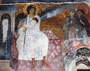 Ο Άγγελος δείχνει τον άδειο Τάφο του Χριστού και τα εντάφια σπάργανα στις Μυροφόρες. (Τοιχογραφία, 13ος αι., Μονή Μιλέσεβα Σερβία). (Επιμέλεια Στέλιος Κούκος) Αγίου Γρηγορίου Παλαμά Αρχιεπισκόπου Θεσσαλονίκης Ομιλία εις την Κυριακήν των Μυροφόρων (Όπου και αναφέρεται ότι πρώτη ή Θεοτόκος είδε τον Κύριο μετά την εκ νεκρών ανάστασί του) Συνέχεια από εδώ: http://www.pemptousia.gr/?p=311053 Προφανώς δε ο ευαγγελιστής άγγελος ήταν αυτός ο ίδιος ο Γαβριήλ. Διότι μόλις την είδε να σπεύδει έτσι προς τον τάφο, αυτός που παλιότερα της είχε πει, μη φόβου, Μαριάμ· εύρες γαρ χάριν παρά τω Θεώ, σπεύδει και τώρα και κατεβαίνει να πει και πάλι το ίδιο στην Αειπάρθενο και να της ευαγγελιστεί την εκ νεκρών ανάστασι εκείνου που γεννήθηκε άσπορος από αυτήν να σήκωση τον λίθο, να επίδειξη κενό τον τάφο ...
