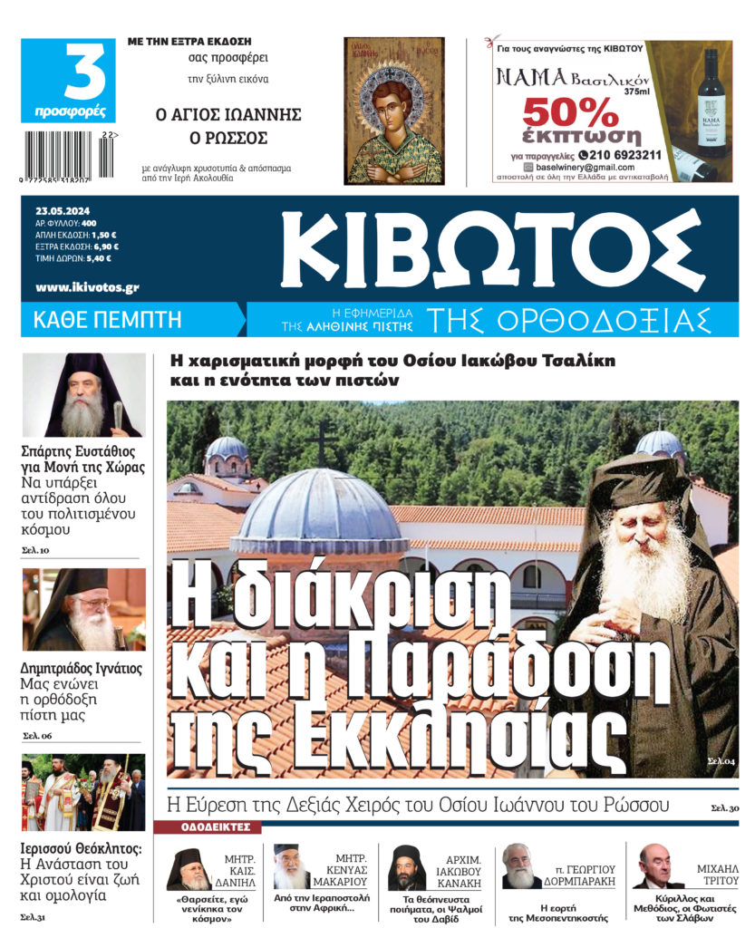 Tην Πέμπτη, 23 Μαΐου, κυκλοφορεί το νέο φύλλο της Εφημερίδας «Κιβωτός της Ορθοδοξίας» – Όλες οι Προσφορές! Την Πέμπτη 23...