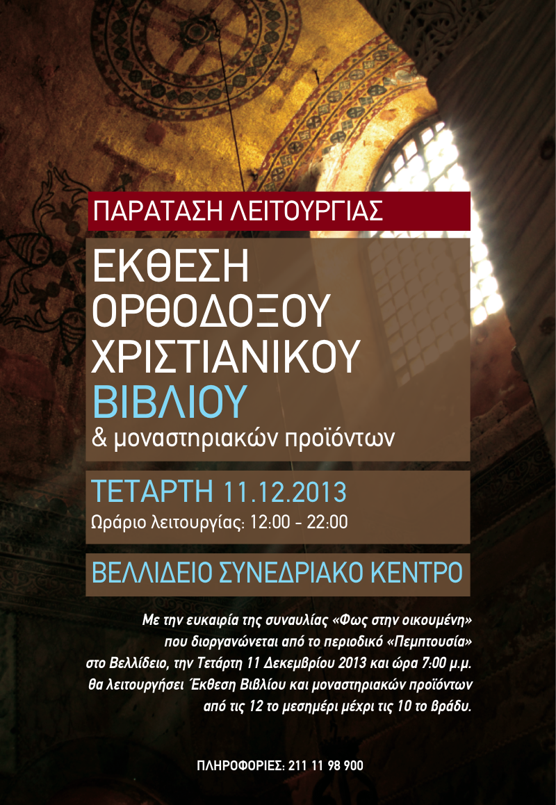 Το διαδικτυακό περιοδικό Πεμπτουσία www.pemptousia.gr διοργανώνει Συναυλία με τον τίτλο «Φως στην οικουμένη» την Τετάρτη 11 Δεκεμβρίου 2013 και ώρα...