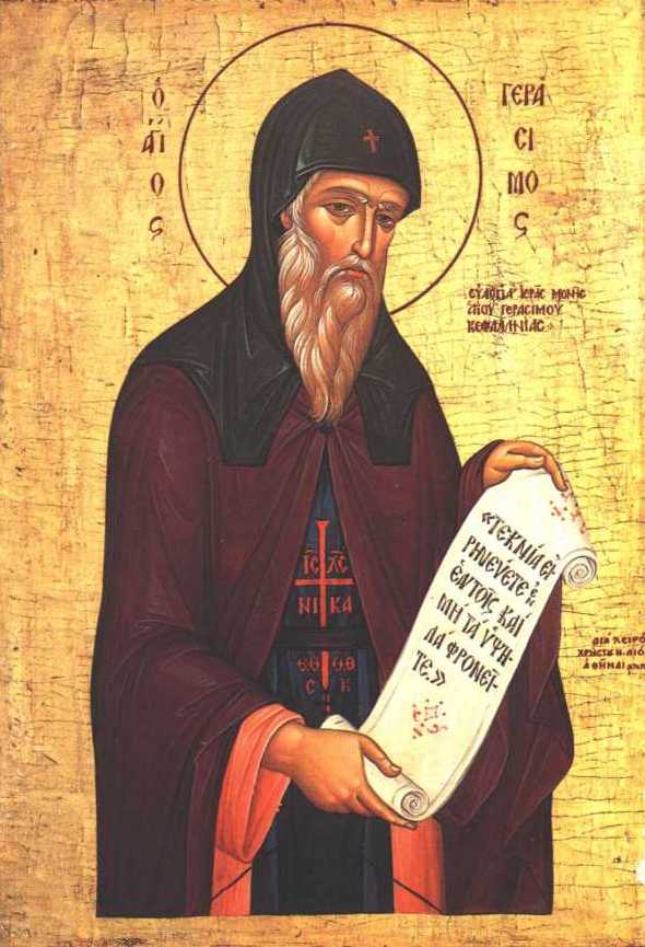 Εορτάζει στις 4 Μαρτίου εκάστου έτους. Υπηρέτης θηρ τω Γερασίμω γέρας, Θήρας παθών κτείναντι πριν λήξαι βίου. Τη δε...