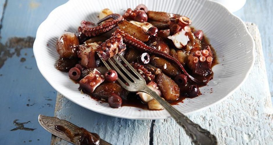 Συστατικά 1 κιλό χταπόδι (πλυμένο και κομμένο σε κομμάτια 2 εκ.) 4 κ.σ. ελαιόλαδο 15 κρεμμυδάκια στιφάδου καθαρισμένα 3 σκ....