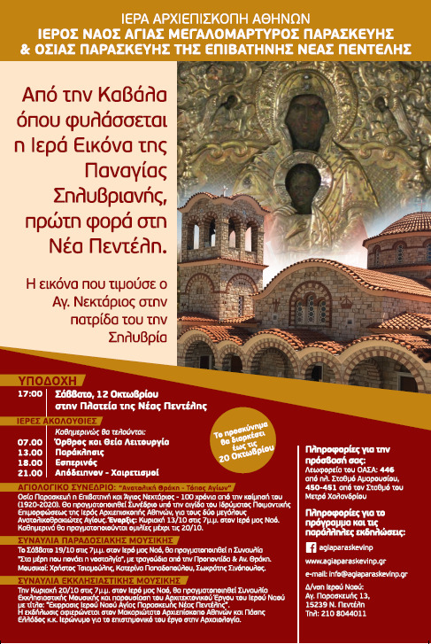 Ιερά Εικόνα της Παναγίας Σηλυβριανής, την οποία τιμούσε ο Άγιος Νεκτάριος, μεταφέρεται για πρώτη φορά στη Νέα Πεντέλη. Υποδοχή: Σάββατο...