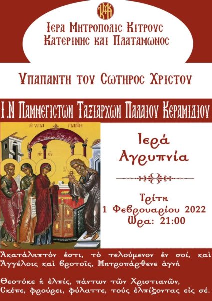 Ιερά Αγρυπνία θα τελεσθεί την Τρίτη 1 Φεβρουαρίου στις 21:00 στον Ιερό Ναό Παμμεγίστων Ταξιαρχών Παλαιού Κεραμιδίου.