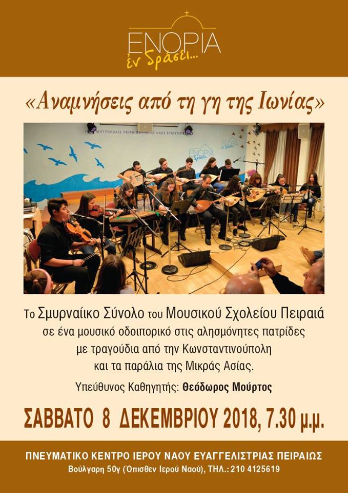 Αφιέρωμα στα τραγούδια της Σμύρνης. Σάββατο 8 Δεκεμβρίου στις 7:30 μ.μ Ιερός Ναός Ευαγγελίστριας Πειραιώς