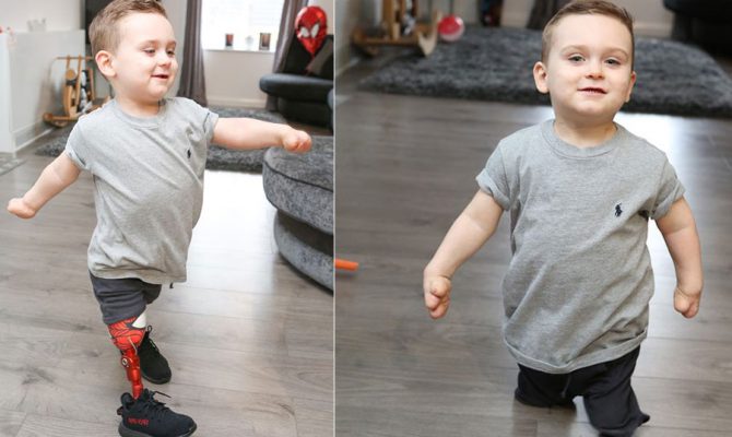 Ένα μικρό αγόρι που έχει και τα 2 του πόδια ακρωτηριασμένα λόγω μηνιγγίτιδας έκανε τα πρώτα του βήματα με τα καινούργια...