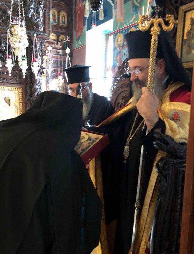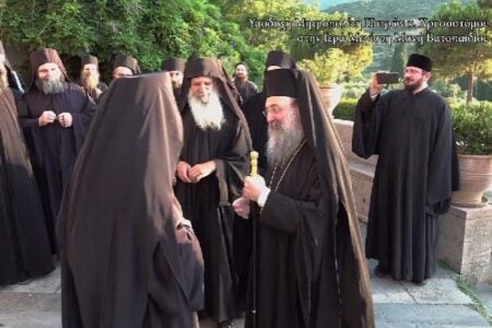 Yποδοχή του Σεβασμιωτάτου Μητροπολίτου Πατρών κ. Χρυσοστόμου από τον Καθηγούμενο της Ιεράς Μεγίστης Μονής Βατοπαιδίου, Γέροντα Εφραίμ, και την βατοπαιδινή...