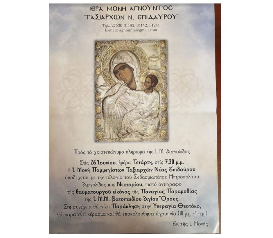 ΣΗΜΕΡΑ, Τετάρτη 26 Ιουνίου 2019, στις 7.30 μ.μ., η Ι. Μονή Παμμεγίστων Ταξιαρχών Νέας Επιδαύρου υποδέχεται, με την ευλογία του...