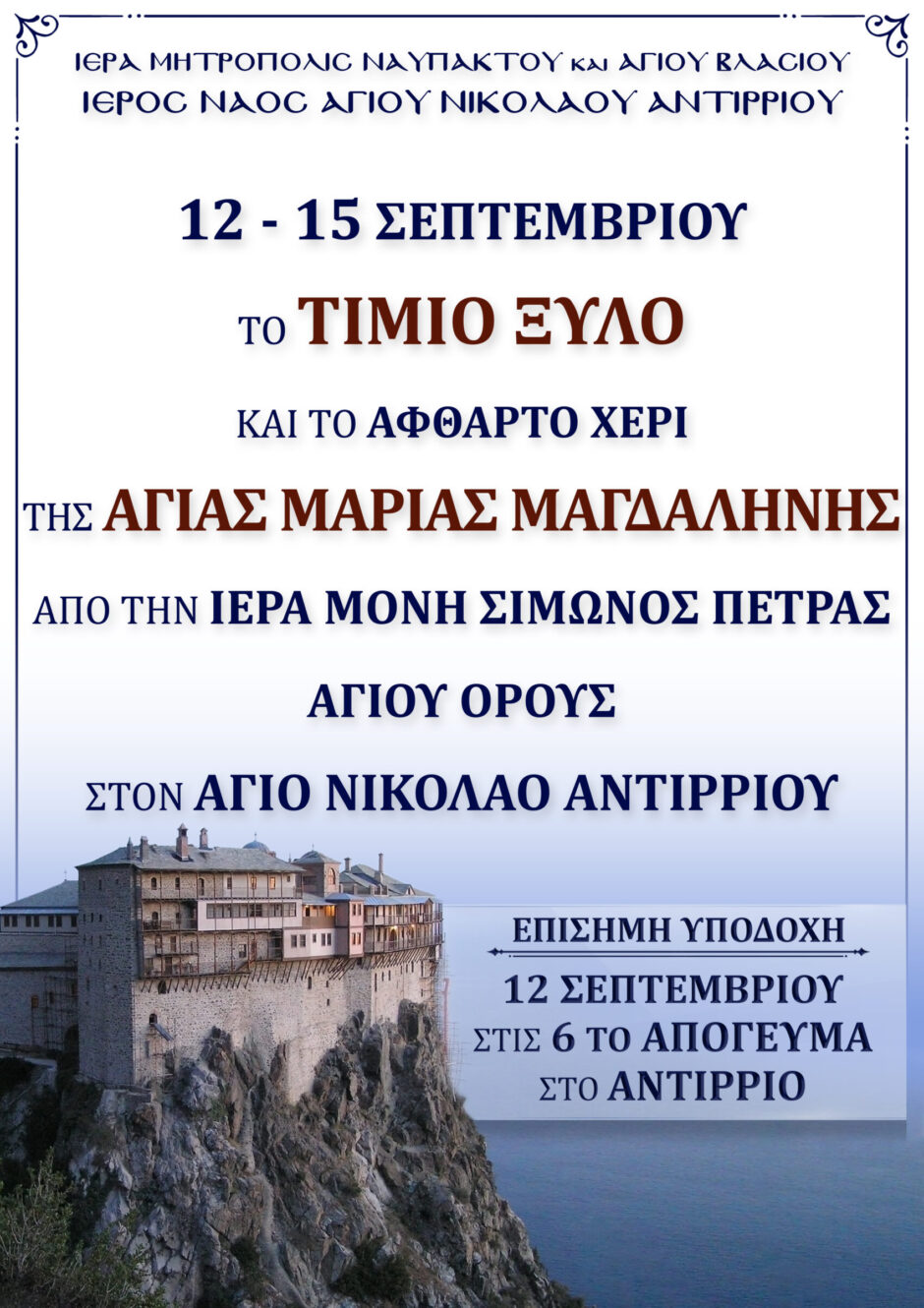 Κατόπιν τῆς εὐλογίας τοῦ Σεβασμιωτάτου Μητροπολίτου Ναυπάκτου καί Ἁγίου Βλασίου κ.κ. Ἱεροθέου, θά μεταφερθοῦν, στόν Ἱερό Ναό Ἁγίου Νικολάου Ἀντιρρίου,...