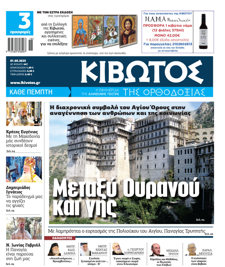 Την Πέμπτη, 1η Μαΐου, κυκλοφορεί το νέο φύλλο της Εφημερίδας «Κιβωτός της Ορθοδοξίας» Την Πέμπτη 01 Μαΐου η εφημερίδα Κιβωτός...