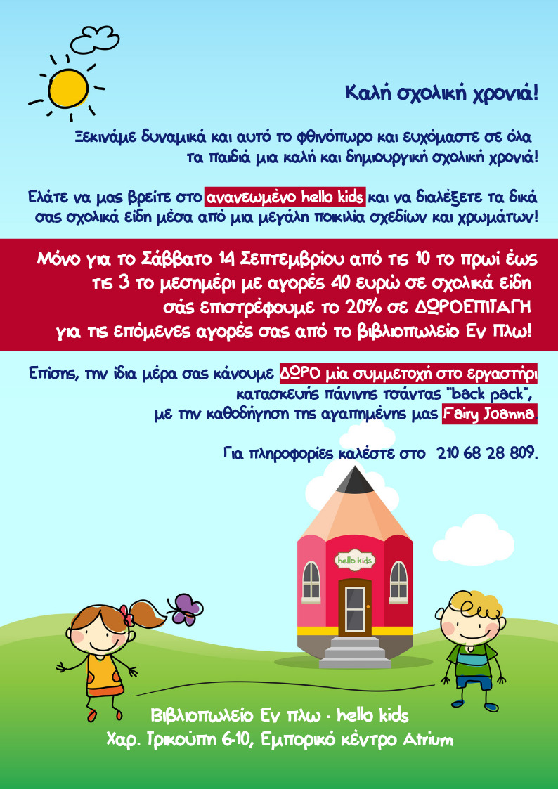 Kαλή σχολική χρονιά απο το βιβλιοπωλείο Εν πλω με μια μεγάλη προσφορά μόνο το Σάββατο 14 Σεπτεμβρίου!