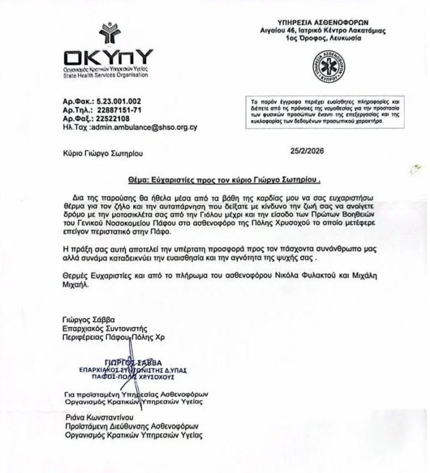 Ο ΟΚΥπΥ σε γραπτή του ανακοίνωση ευχαριστεί τον Γιώργο Σωτηρίου για τον ζήλο και την αυταπάρνηση που έδειξε με κίνδυνο την ζωή του, ανοίγοντας τον δρόμο με την μοτοσικλέτα του σε ασθενοφόρο, από την Γιόλου μέχρι την είσοδο τον πρώτων βοηθειών του ΓΝ Πάφου, το οποίο μετέφερε επείγον περιστατικό μικρού παιδιού που πνιγόταν από τον εμετό του.